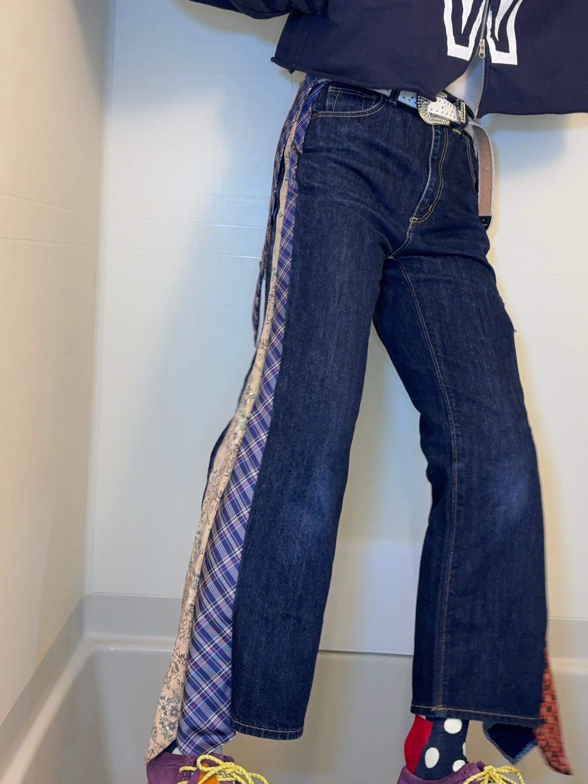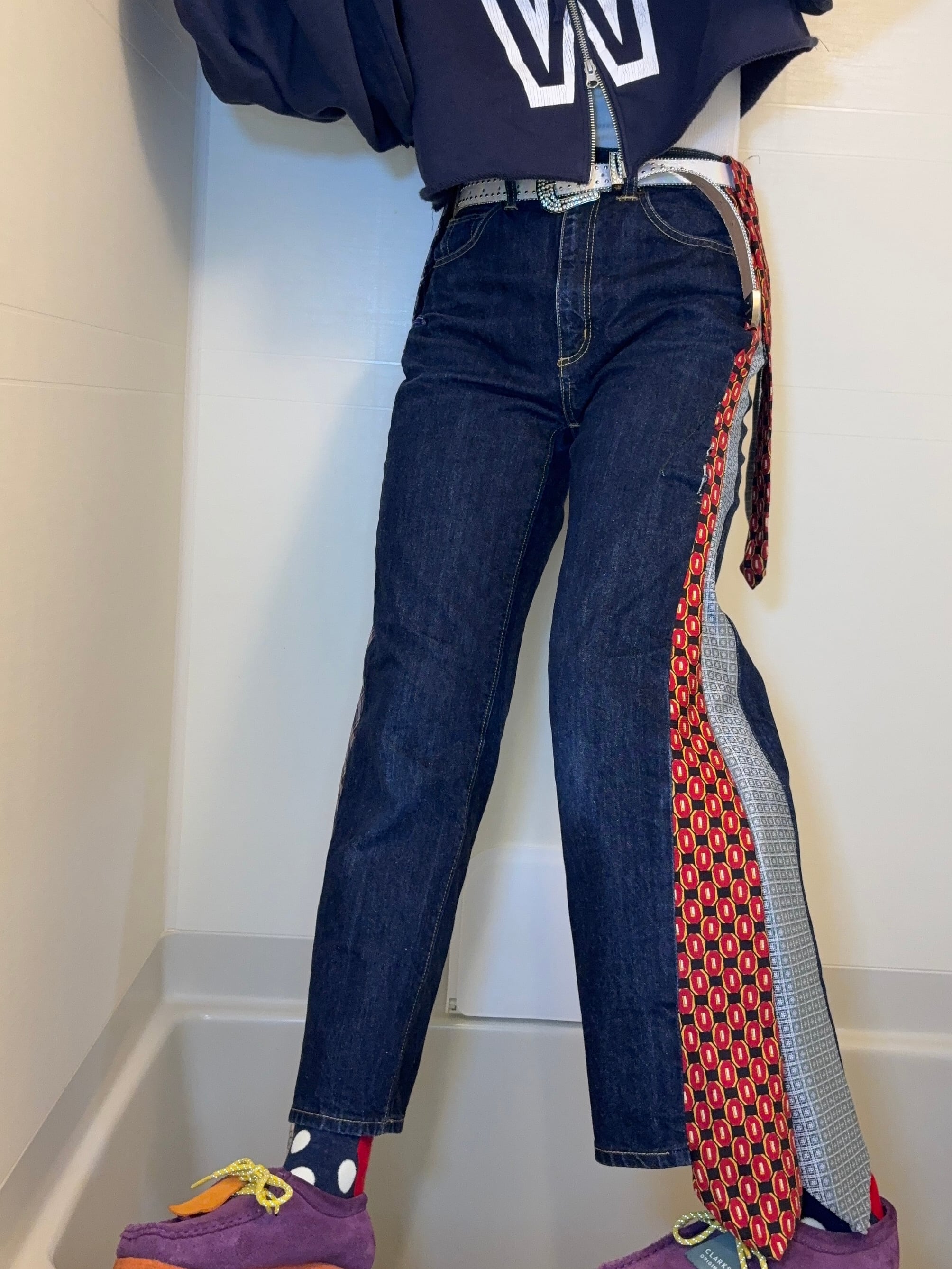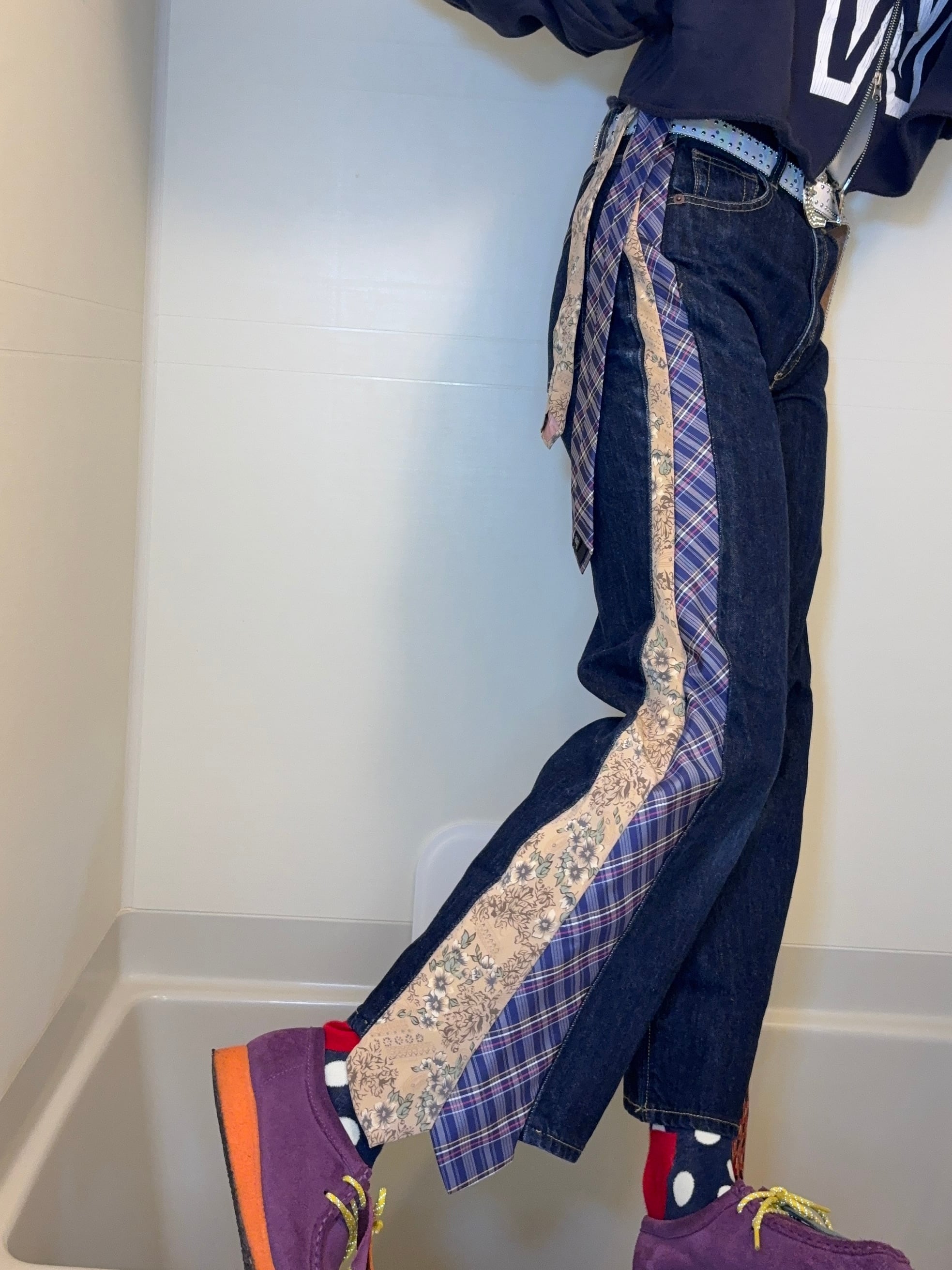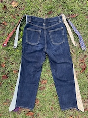 デニムパンツの両サイドに、異なるネクタイを縫い込んだ一点物リメイクデニム!