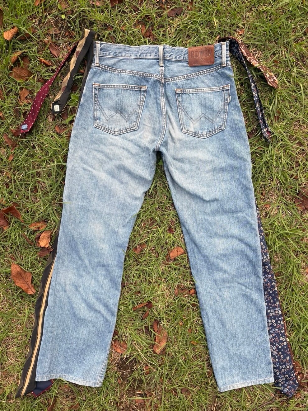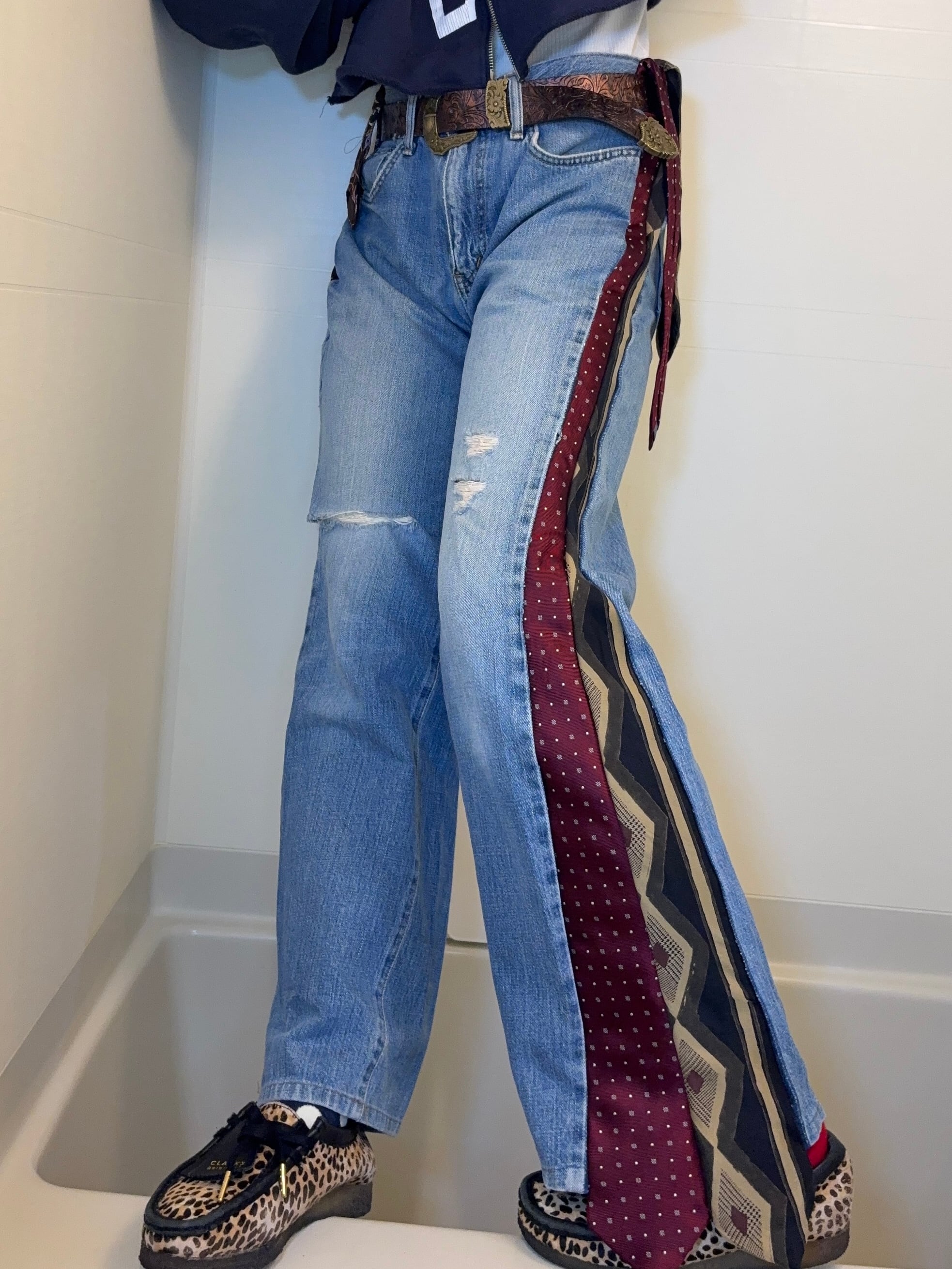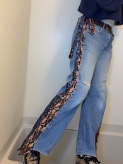 デニムパンツの両サイドに、異なるネクタイを縫い込んだ一点物リメイクデニム!