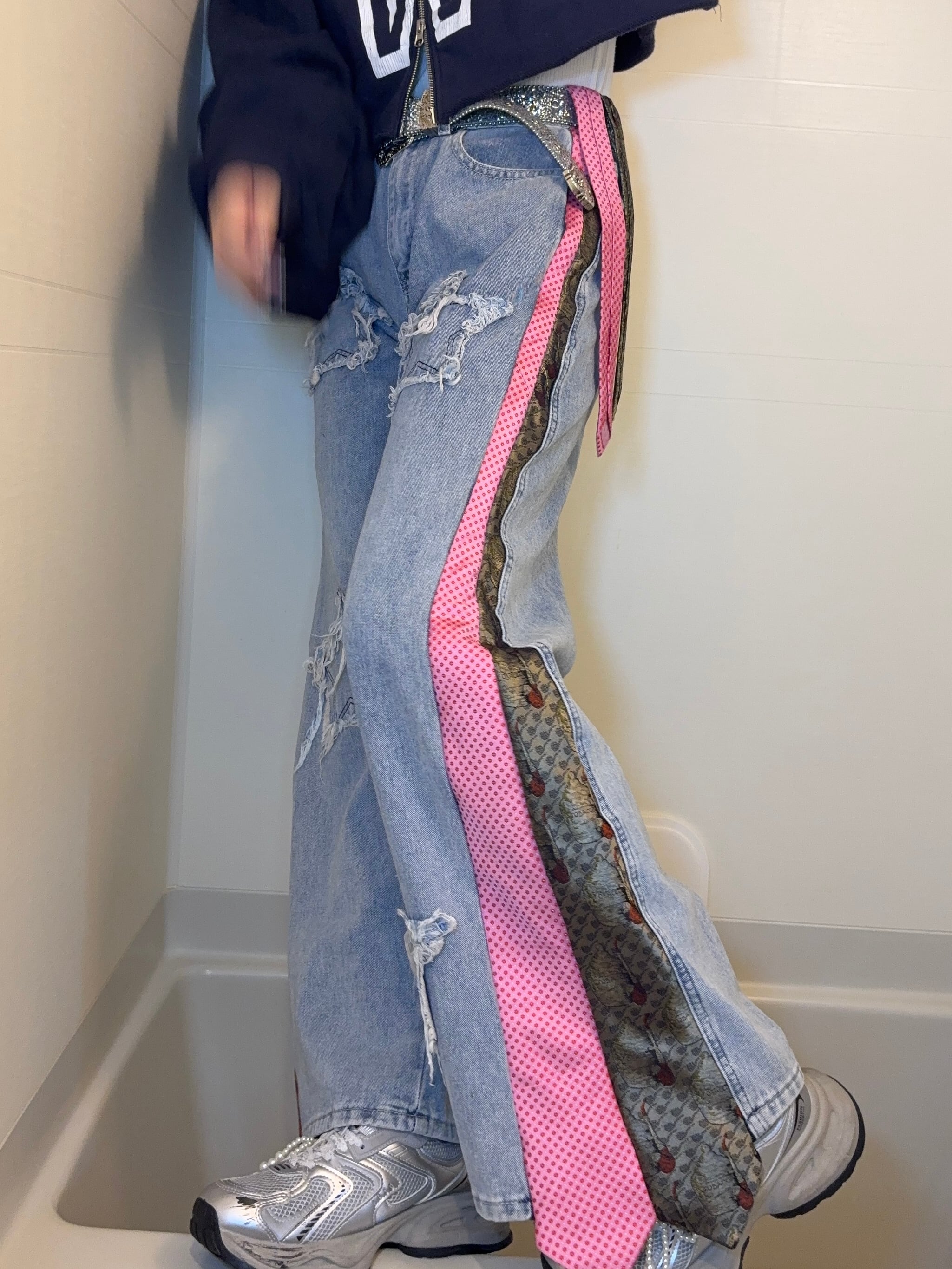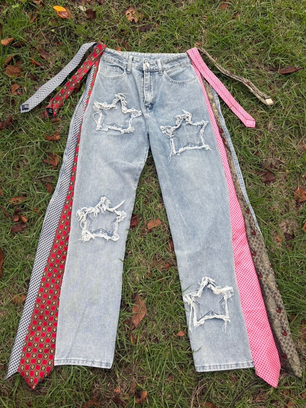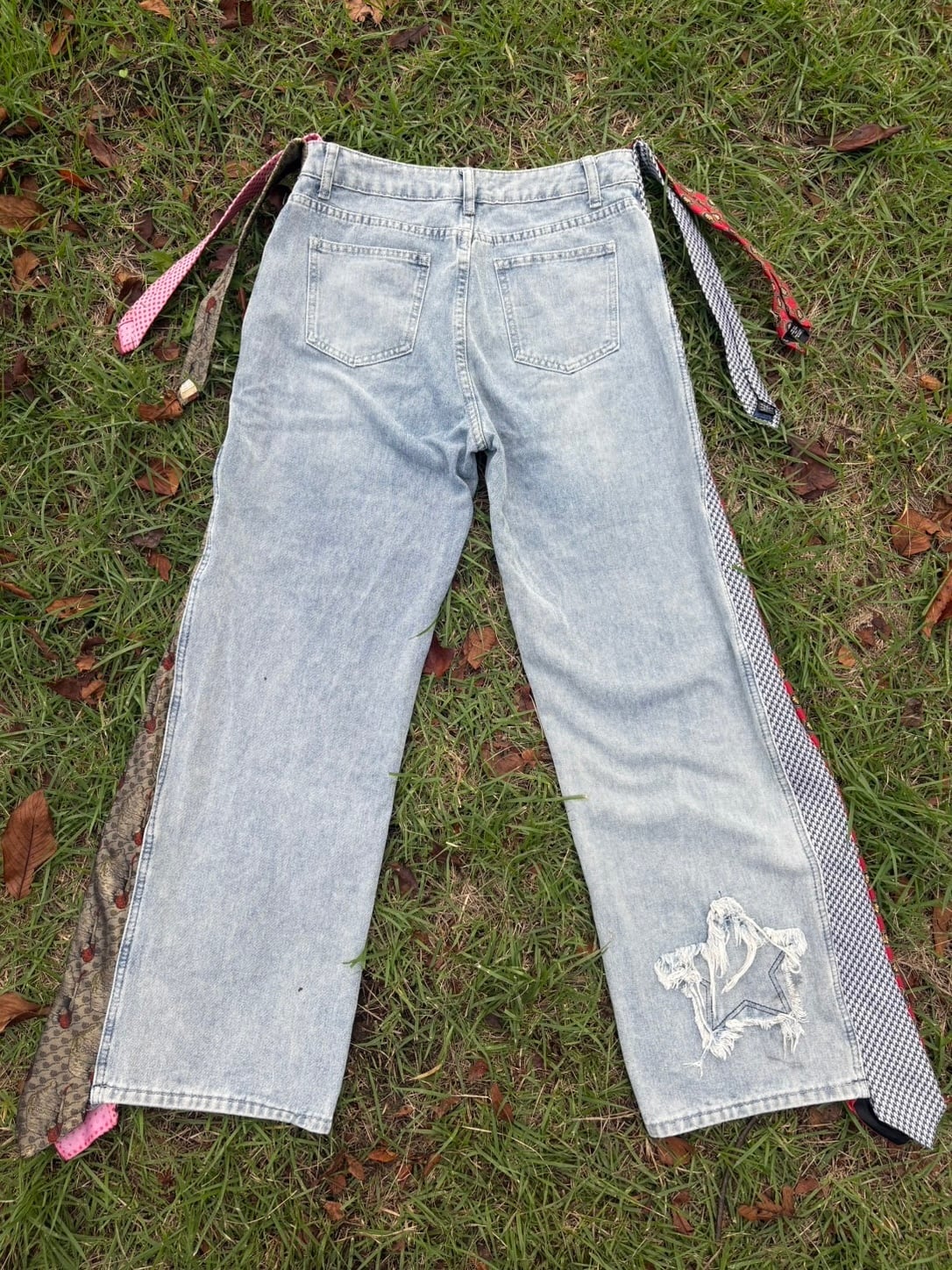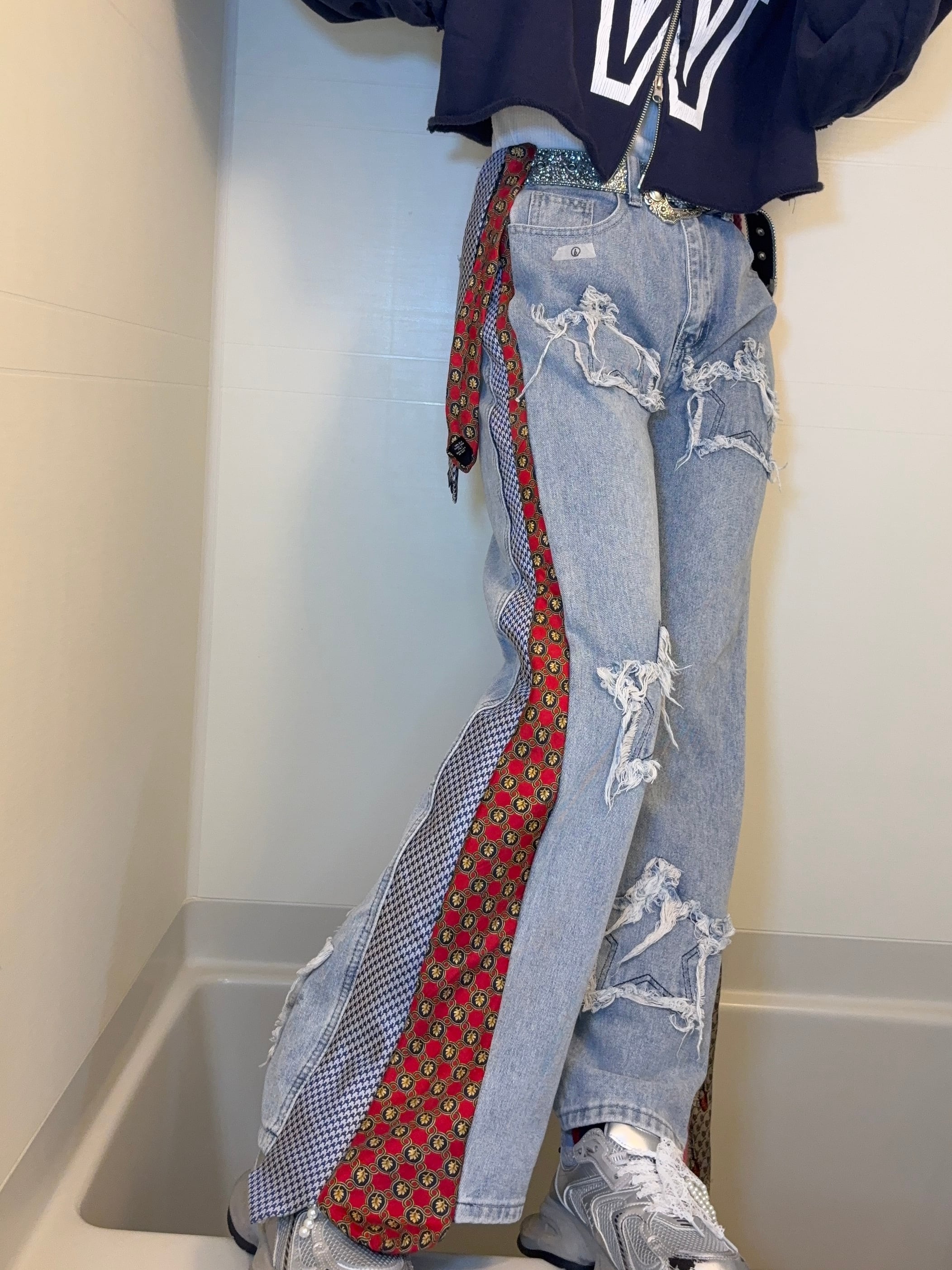 デニムパンツの両サイドに、異なるネクタイを縫い込んだ一点物リメイクデニム!